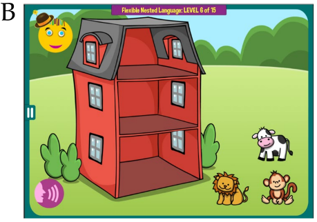 Na sliki B je primer verbalne naloge z navodilom »Imagine. The lion lives above the monkey and underneath the cow. Take animals home.« (slovensko: Predstavljaj si. Lev živi nad opico in pod kravo. Pelji živali domov).