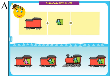 Na sliki A lahko je primer neverbalne naloge z navodilom »Find the correct train.« (slovensko: Najdi pravi vlak).